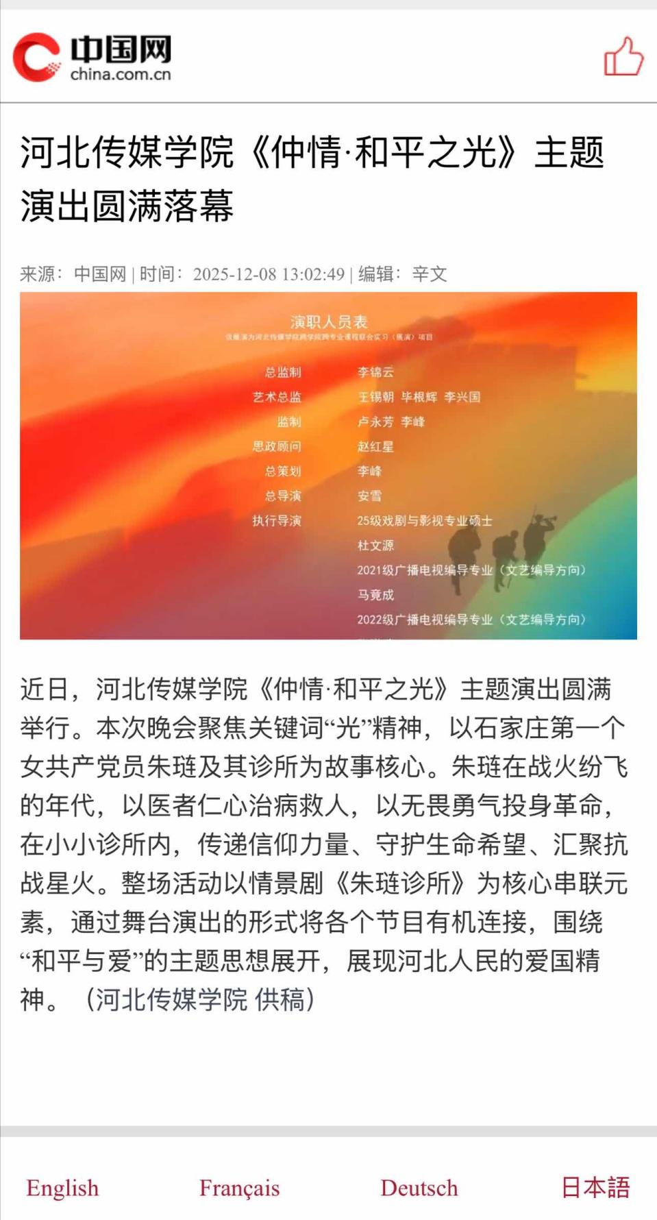 我校跨专业课程联合实习项目《仲情·和平之光》创演晚会在中国网独家播出