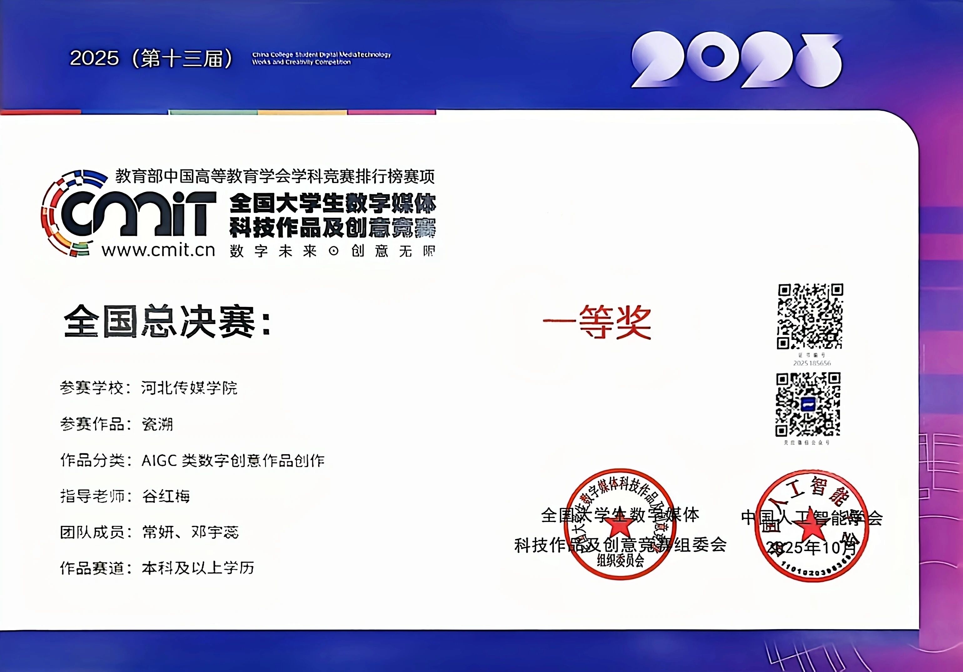10月24日至26日,由中国人工智能学会等单位联合主办的第十三届全国大学生数字媒体科技作品及创意竞赛全国总决赛暨颁奖典礼在哈尔滨工业大学成功举办。我校人工智能学院数字媒体技术专业学生表现优异,荣获一等奖1项、三等奖11项。
