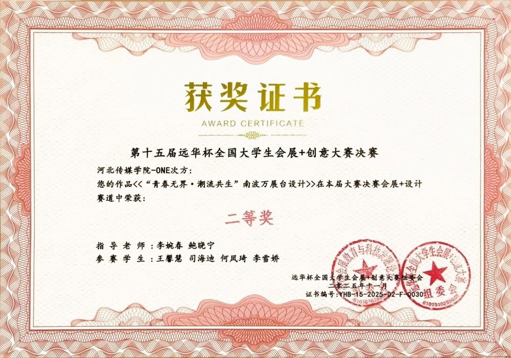 11月7日至9日,第十五届“远华杯”全国大学生会展+创意大赛决赛在广州清远成功举办。作为全国会展专业领域极具影响力的赛事,本届大赛吸引了来自全国87所高校的464支队伍同台竞技,并最终筛选出113支队伍晋级决赛。我校学生凭借出色的综合表现在决赛中斩获多项荣誉:河北传媒学院获教学成果一等奖,“新星之火队”《首届河北文化旅游博览会》、“星河队”《第二十三届中国玩具展》摘得一等奖,其余队伍斩获二等奖5项。
